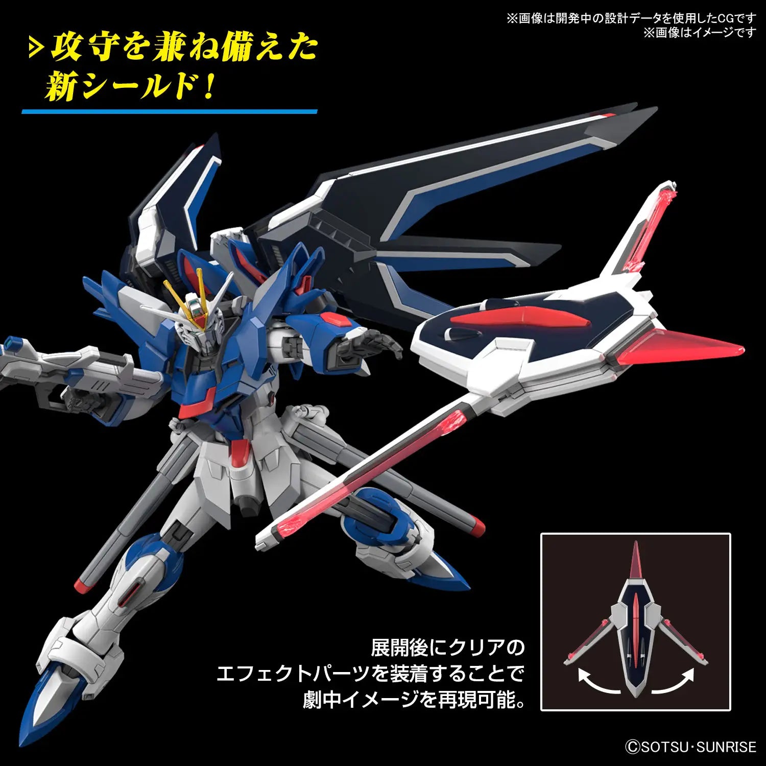 The new shield combines offense and defense, with clear parts and polarized molding that create a stunning color shift effect. The two beam sabers can be connected, and the kit replicates the powerful Hi-Mat Full Burst mode with mechanisms for wing deployment, Agni cannon activation, and extending the waist rail gun.
